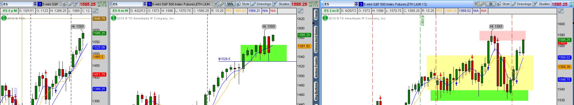 I was asked a very good question last night at Albuquerque Market Traders MeetUp. Are you bullish or bearish on the overall market? See the above chart which is from left to right.. a monthly, Weekly and Daily of the /ES. This is the mini future of the S&P 500. I like to evaluate the monthly before I look at the weekly, the weekly before looking at the daily and so on. Looking at the monthly chart we are in a nice parabolic up trend. The weekly is in an up trend with a minor pause the last six weeks. The daily looks more sideways however it has bounced three times off of its support. Now we are approaching the resistance area which is on the daily chart above in red. If we get a close above this. I will look for the price to pull back to the top of the box, testing what was resistance which now will become support. If this happens we will be back into blue sky. So I am as I said last night bullish monthly, bullish weekly and bullish to neutral daily.