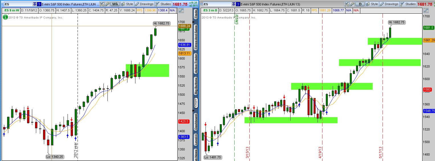 This is an amazing move on Bernanke comments today. The Fed needs to continue with QE. This is crazy and when they stop QE look out below. I have no idea what the FOMC minutes will reveal later today. Looking at a chart of the $ES you can see the stair step move. This is indicative of a strong up trend. Be careful though. This market needs to correct.