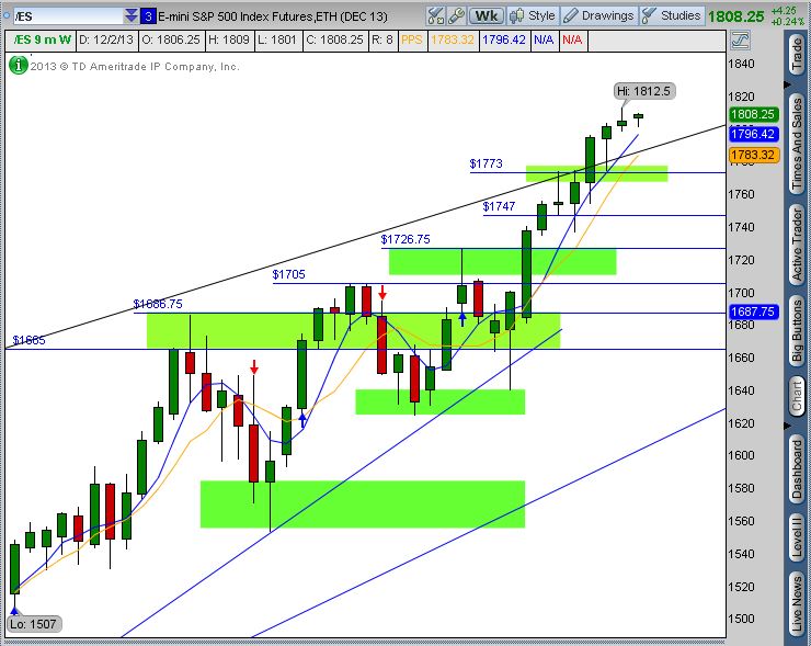 Getting a little tricky here. I have a target of around 1860 by the end of the month. See if we have the push (volume) to get us there. I am looking for 1830 first. All of this is only if the 1773 area holds. If the 1773 area gives it up then look for the next level to hold 1727. I am still bullish this market. I entered one long position LLY last week. I am taking some heat on this trade for now. I am long with no risk on BAC PRU and XLE. December can be one of the most difficult months to trade. Look for retail to influence trading this month. So let’s see how it goes. Happy Trading.