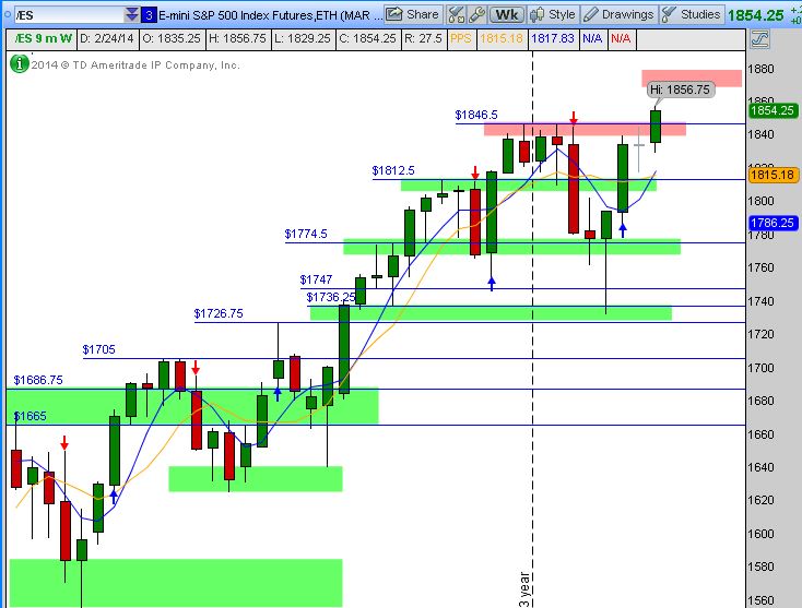 This high has a few things happening that have me proceeding with caution. First off the latest COT report has small spec very bullish and the Large spec getting bearish. Big money is short. However price is king and price is rocking to the upside. I think this goes to the 1877 area then pulls back. I am not sure it will be a topping pattern for the /ES. We shall see. The DIA etf that mirrors the Dow is another story. I mentioned a few weeks back that I am getting short signals for the Dow. $DJI watch 16522. I think this holds and we see it head south. I am waiting for this next turn down before I short it. Gold, Silver and the miners are taking off. this could be another sign that we are not going to get much higher. In summary price is king and we trade what we see. Happy trading.